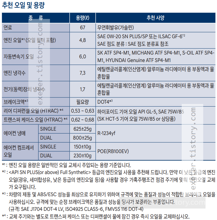- 엔진 오일: 4.8 리터 (SAE 0W-20 SN PLUS/SP 또는 ILSAC GF-6*2)