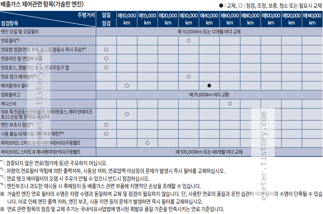 ※ 연료 관련 항목의 점검 및 교체 주기는 국내석유사업법에 명시된 휘발유 품질 기준을 만족시키는 연료 기준입니다.