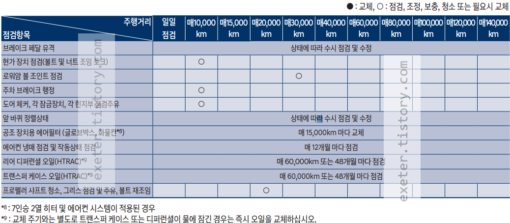 - 트랜스퍼 케이스 오일(HTRAC)*9: 매 60,000km 또는 48개월 마다 점검