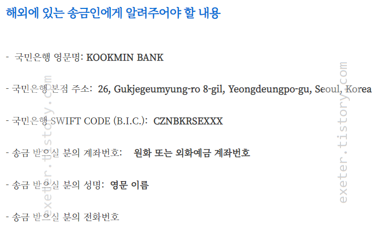 본 게시글은 해외로부터 한국(국내) 국민은행으로 송금 받는 경우 필요한 내용입니다.
