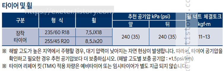 ※ 해발 고도가 높은 지역에서 주행할 경우, 대기 압력이 낮아지는 자연 현상이 발생합니다. 따라서, 타이어 공기압을 확인하고 필요한 경우 추천 공기압보다 더 보충하십시오. (해발 고도별 보충 공기압 : +1.5psi/km)