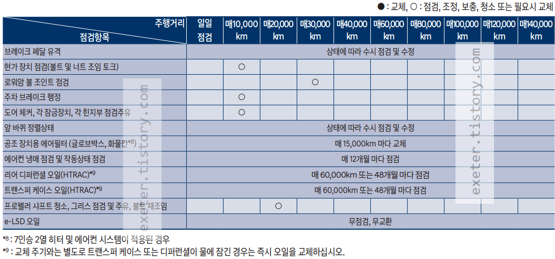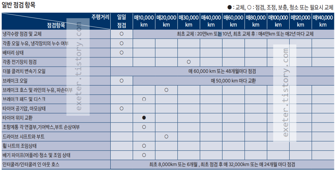 최초 80,000km 또는 48개월 점검, 이후 매 20,000km 또는 12개월 마다 점검
