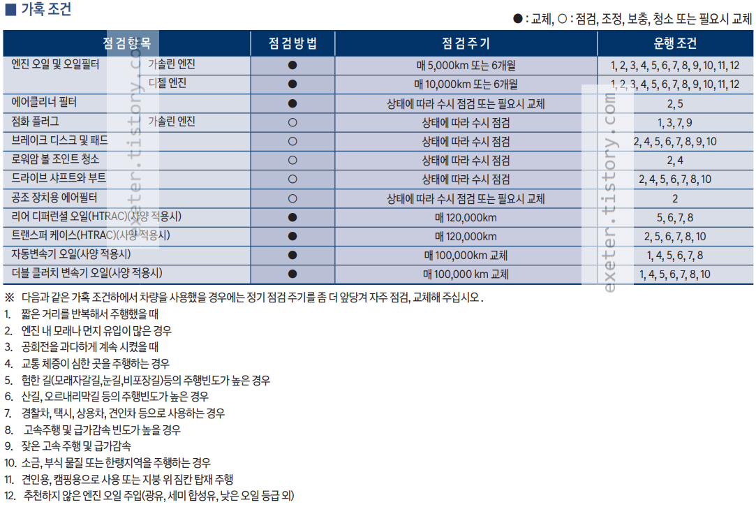 차량 사용 설명서에서는 '가혹 조건'인 경우 교환/점검 주기를 빠르게 가져가도록 안내하고 있습니다.