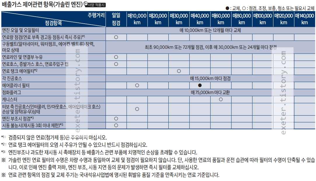 ※ 연료 관련 항목의 점검 및 교체 주기는 국내석유사업법에 명시된 휘발유 품질 기준을 만족시키는 연료 기준입니다.