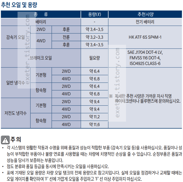 아래 그림에서 추천 오일/규격 및 용량 등 추천 사양을 참고하시기 바랍니다.