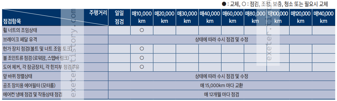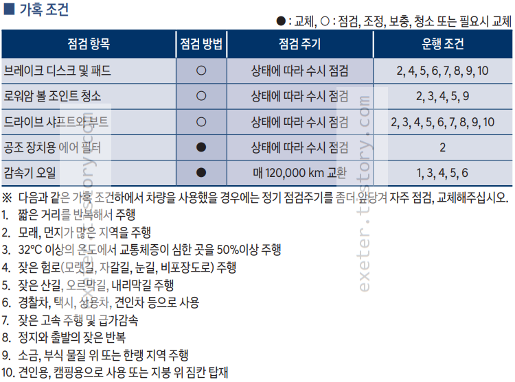 가혹조건 주행의 경우 아래 교체/점검 항목을 참고하세요.