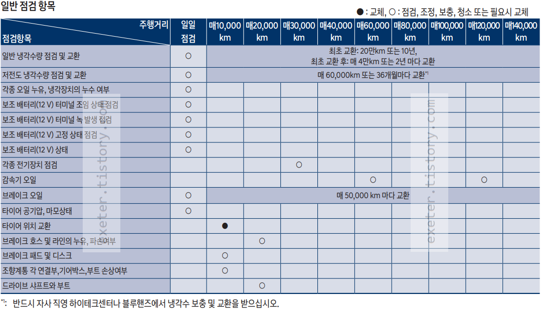 - 저전도 냉각수량 점검 및 교환: 매 60,000km 또는 36개월마다 교환