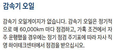 감속기 오일은 정기적으로 매 60,000km 마다 점검하고, 가혹 조건에서 자주 운행했을 경우에는 정기 점검 주기표에 따라 자사 직영 하이테크센터에서 점검을 받으십시오.