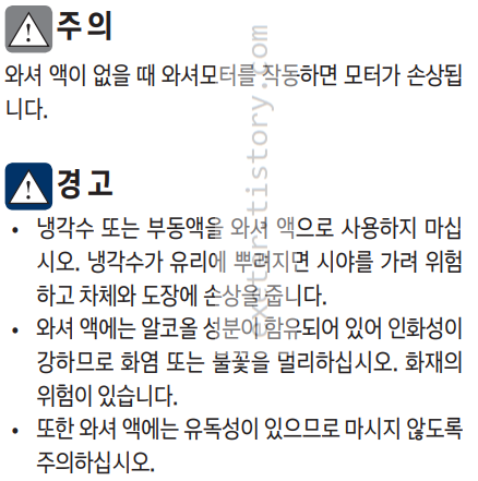 • 따뜻한 계절에는 일반 수돗물이나 시판되는 와셔액을 사용해도 되나, 겨울에는 와셔액의 빙결을 방지 하도록 겨울용 와셔액을 사용하십시오. 와셔액이 빙결되면 와셔액 탱크와 와셔 모터가 손상될 수 있습니다.