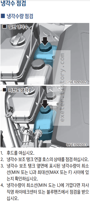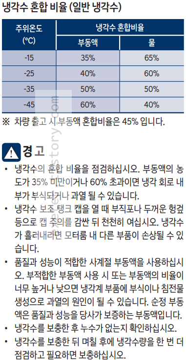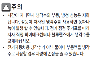 • 시간이 지나면서 냉각수의 부동, 방청 성능은 저하 됩니다. 성능이 저하된 냉각수를 사용하면 동파나 녹이 발생 할 수 있습니다. 정기 점검 주기표를 따라 자사 직영 하이테크센터나 블루핸즈에서 냉각수를 교체하십시오.