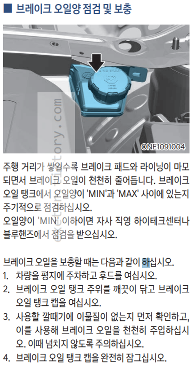 브레이크 오일 탱크에서 오일양이 'MIN'과 'MAX' 사이에 있는지 주기적으로 점검하십시오.