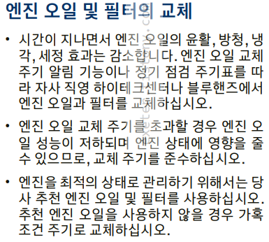• 시간이 지나면서 엔진 오일의 윤활, 방청, 냉 각, 세정 효과는 감소합니다. 엔진 오일 교체 주기 알림 기능이나 정기 점검 주기표를 따 라 자사 직영 하이테크센터나 블루핸즈에서 엔진 오일과 필터를 교체하십시오.