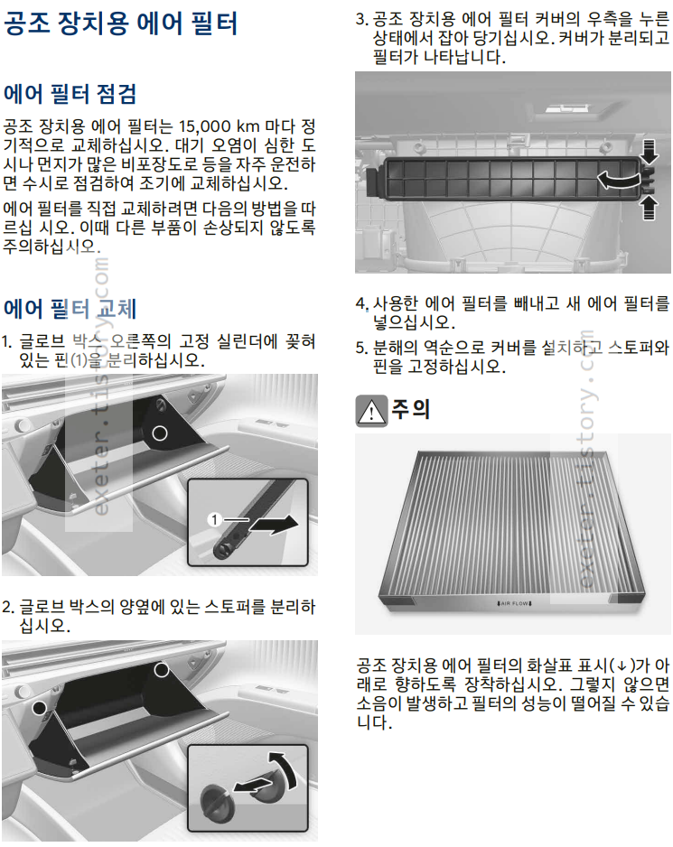 공조 장치용 에어 필터는 15,000 km 마다 정기적으로 교체하십시오.