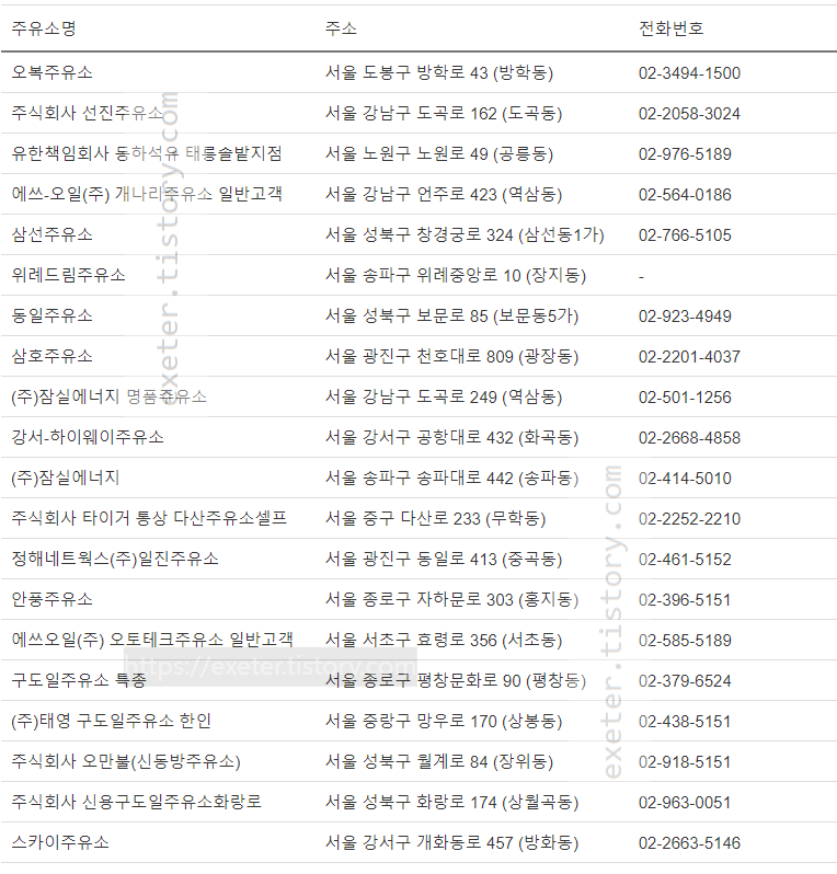 | 주유소명 | 주소 | 전화번호 |