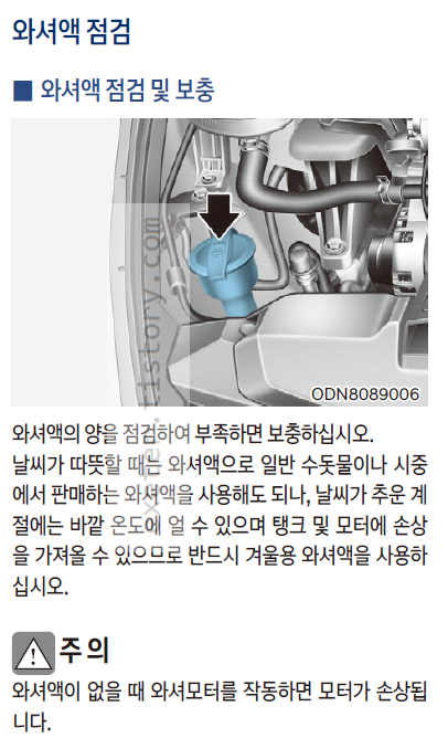 와셔액의 양을 점검하여 부족하면 보충하십시오. 날씨가 따뜻할 때는 와셔액으로 일반 수돗물이나 시중 에서 판매하는 와셔액을 사용해도 되나, 날씨가 추운 계절에는 바깥 온도에 얼 수 있으며 탱크 및 모터에 손상을 가져올 수 있으므로 반드시 겨울용 와셔액을 사용하십시오.