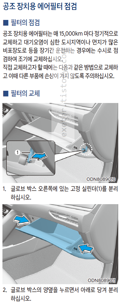 공조 장치용 에어필터는 매 15,000km 마다 정기적으로 교체하고 대기오염이 심한 도시지역이나 먼지가 많은 비포장도로 등을 장기간 운전하는 경우에는 수시로 점검하여 조기에 교체하십시오.