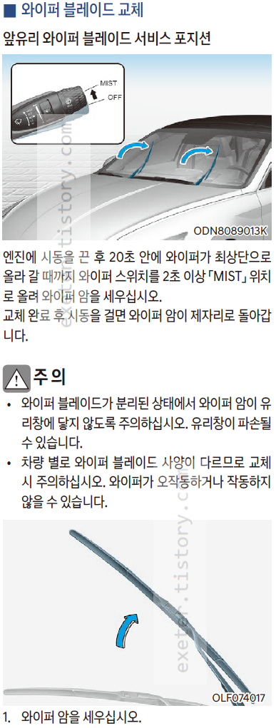 엔진에 시동을 끈 후 20초 안에 와이퍼가 최상단으로 올라 갈 때까지 와이퍼 스위치를 2초 이상 「MIST」 위치로 올려 와이퍼 암을 세우십시오.