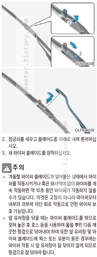 • 와이퍼 블레이드가 분리된 상태에서 와이퍼 암이 유리창에 닿지 않도록 주의하십시오. 유리창이 파손될 수 있습니다.