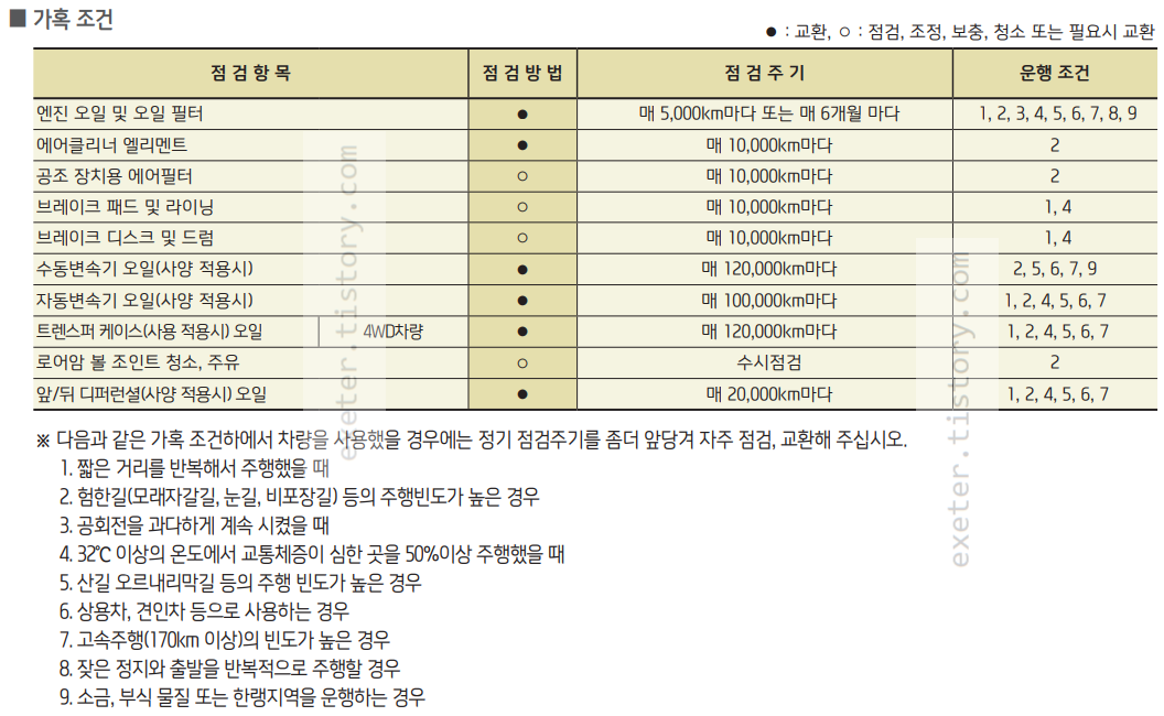 차량 사용 설명서에서는 '가혹 조건'인 경우 교환/점검 주기를 빠르게 가져가도록 안내하고 있습니다.