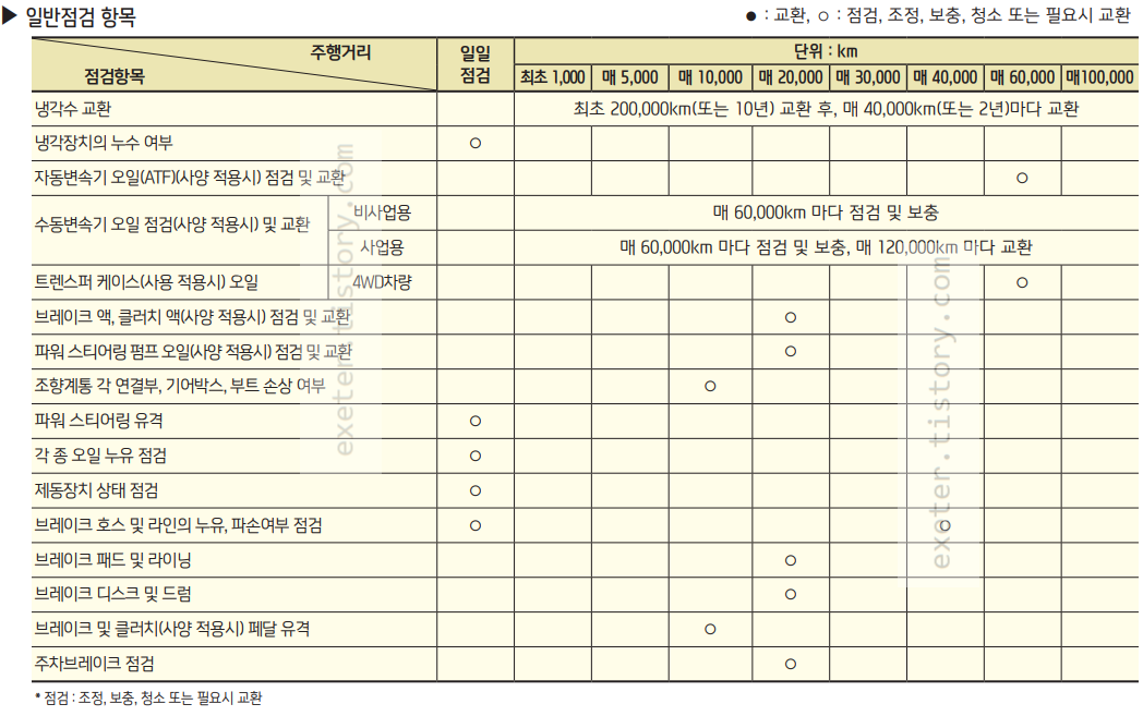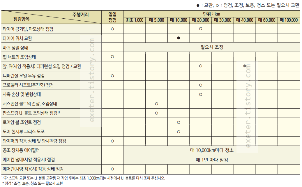 - 앞, 뒤(사양 적용시) 디퍼런셜 오일 점검 / 교환: 매 20,000km 점검 및 40,000km 교환