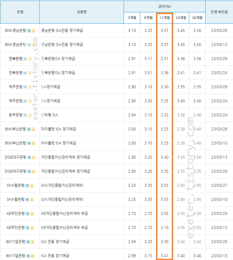 ISA 예금 은행금리 - 1년(12개월) 기준 / 높은 순서 정렬 (중복 은행 제외)
