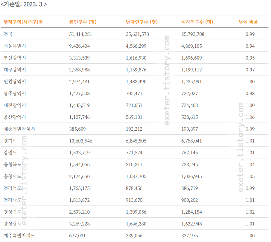 아래 표는 2023년 3월 기준 통계 자료로, 각 광역시/행정구역별 인구수(남자/여자) 및 남여 비율입니다.