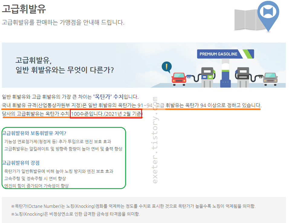 현대오일뱅크 고급유는 옥탄가 수치 100 수준으로 안내하고 있습니다.