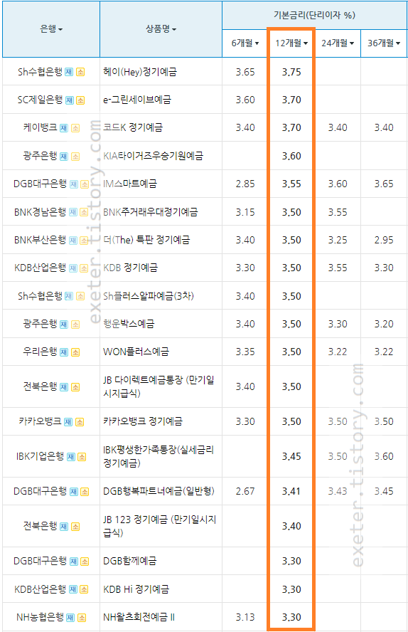 1년 기준 SH수협은행 1년 (12개월) 기준 예금의 경우 가장 높은 금리(3.75 %)를 제공하고 있습니다.