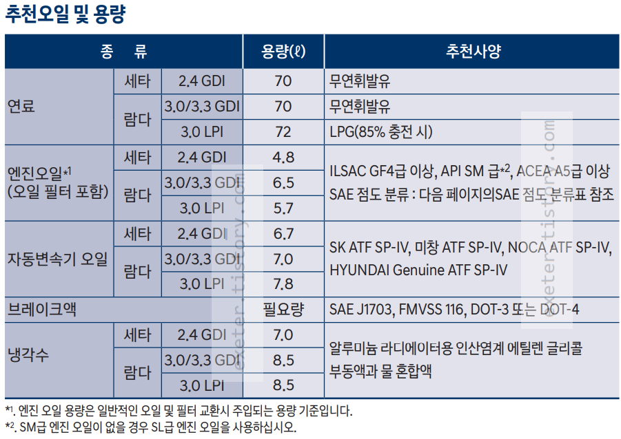 - 엔진오일(세타 2.4GDI) : 4.8 리터 (ILSAC GF4급 이상, API SM 급*2, ACEA A5급 이상)