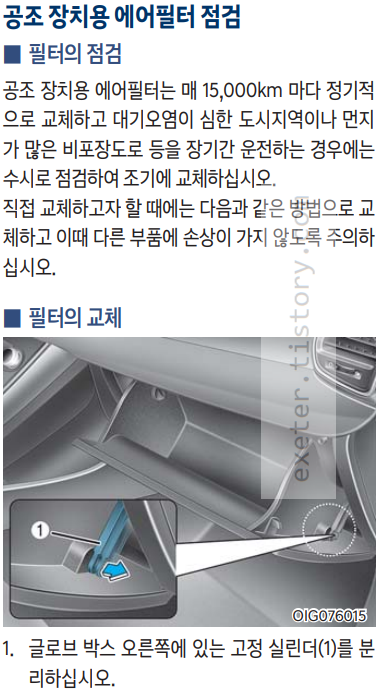 공조 장치용 에어필터는 매 15,000km 마다 정기적 으로 교체하고 대기오염이 심한 도시지역이나 먼지 가 많은 비포장도로 등을 장기간 운전하는 경우에는 수시로 점검하여 조기에 교체하십시오.