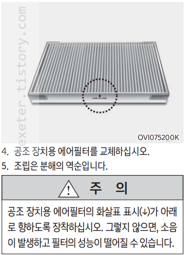 주의 - 공조 장치용 에어필터의 화살표 표시(↓)가 아래로 향하도록 장착하십시오.