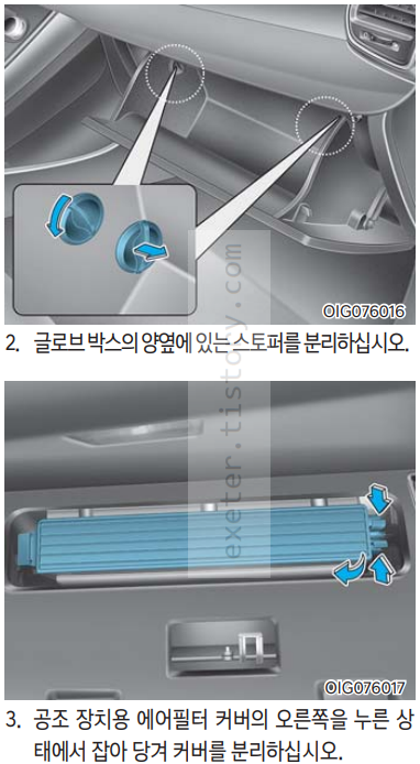 비슷한 연식의 현대/기아 자동차라면 에어컨 필터 교체 방식이 거의 유사한 형태이므로 참고 가능합니다.