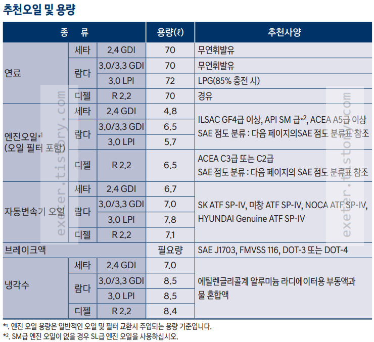 - 엔진오일(세타 2.4GDI) : 4.8 리터 (ILSAC GF4급 이상, API SM 급*2, ACEA A5급 이상)