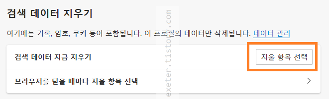 3) 오른쪽 화면에서 스크롤을 아래로 내린다음, '검색 데이터 지우기' 메뉴 에서 [지울 항목 선택] 클릭