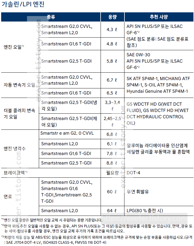 - 엔진오일(G2.0 CVVL, L2.0) : 4.3 리터 (API SN PLUS/SP 또는 ILSAC GF-6*2)