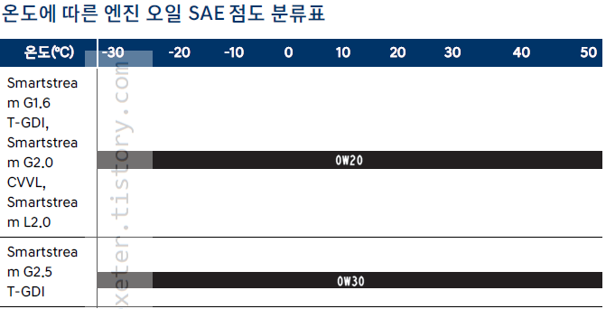 아래는 2024 쏘나타 매뉴얼에서 발췌한 '온도에 따른 엔진 오일 SAE 점도 분류표'입니다.