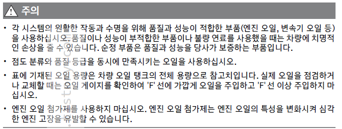 *2:만약 위의 추천 오일을 사용할 수 없는 경우, API SN PLUS(또는 그 이상) 등급의 합성유를 사용할 수 있습니다. 만약, 광유 또는 세미-합성유를 사용할 경우, 엔진 오일 교체 주기의 가혹 조건을 따르십시오.