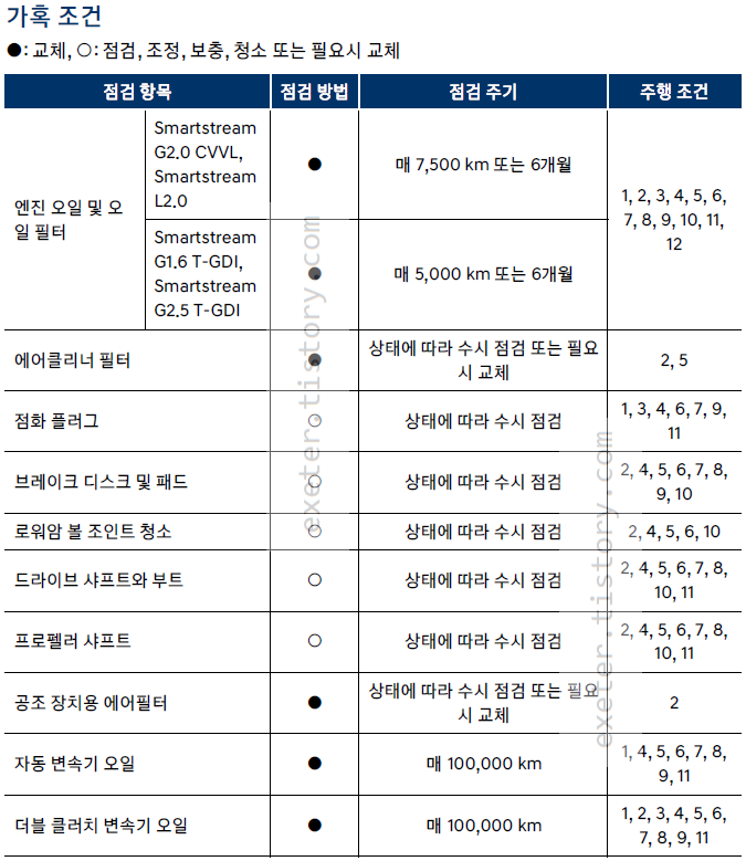 가혹 조건인 경우 일반적인 운행조건 대비 점검/교체 주기가 더 짧습니다.