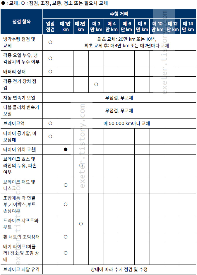 : 최초 90,000km 또는 72개월 점검, 이후 매 30,000km 또는 24개월 마다 점검