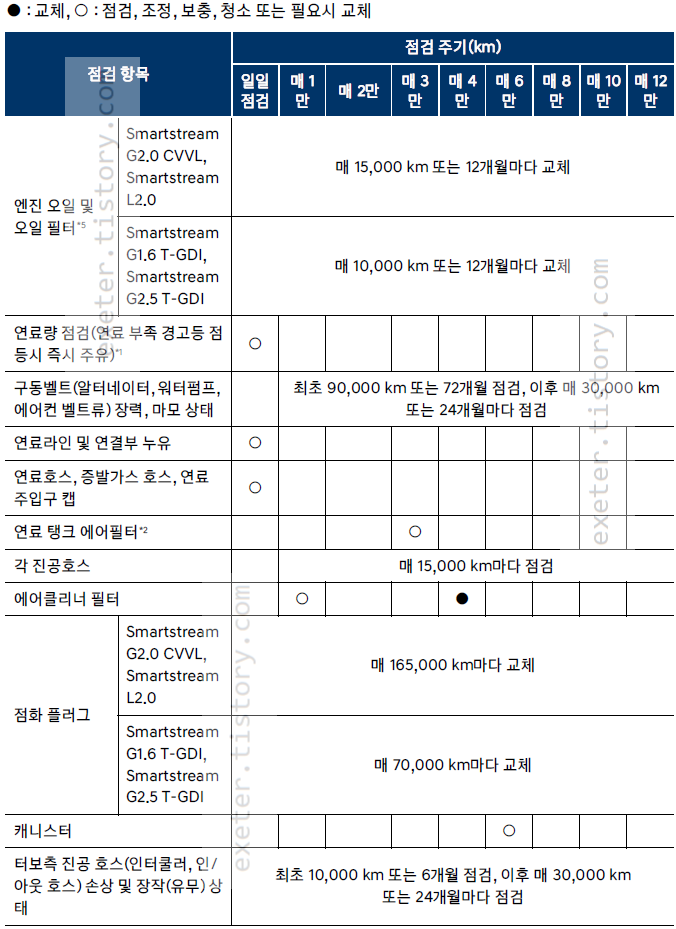 - 엔진 오일 및 오일필터 (G1.6 T-GDI, G2.5 T-GDI): 매 10,000km 또는 12개월 마다 교환