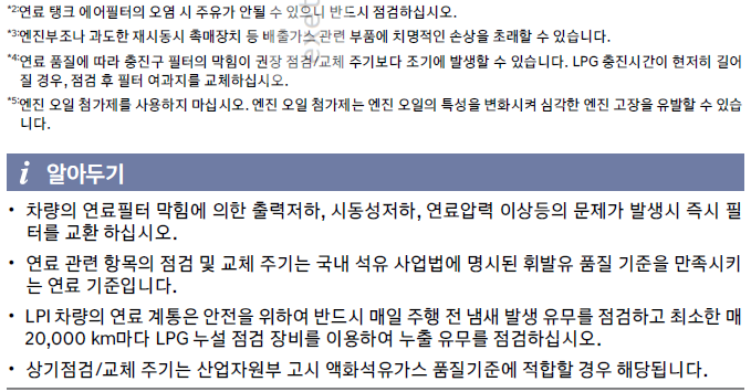 - 엔진 오일 및 오일필터 (G2.0 CVVL, L2.0): 매 15,000km 또는 12개월 마다 교환