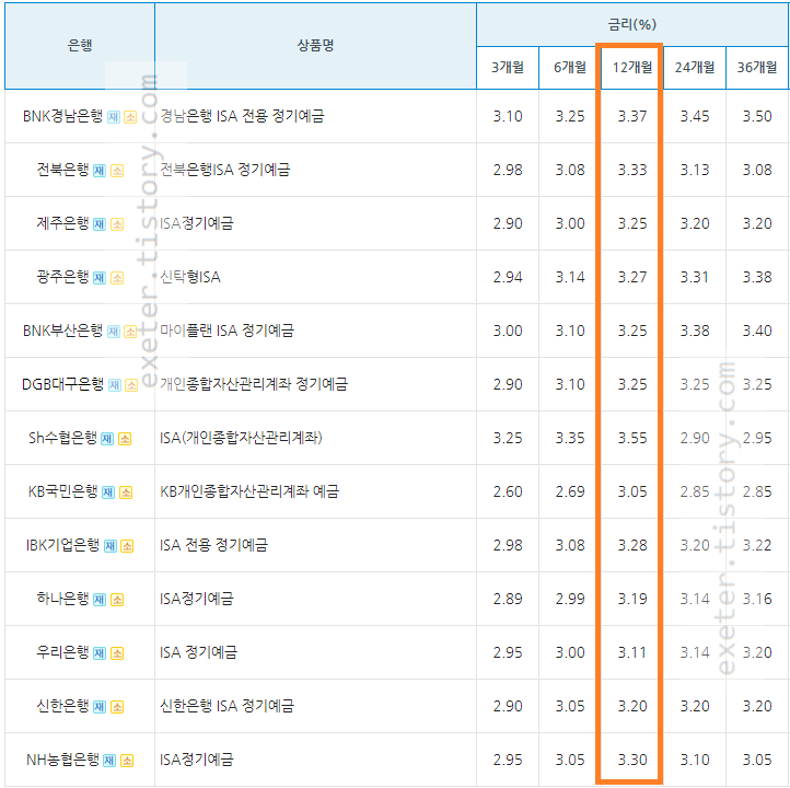 ISA 예금 은행금리 - 1년(12개월) 기준 / 높은 순서 정렬