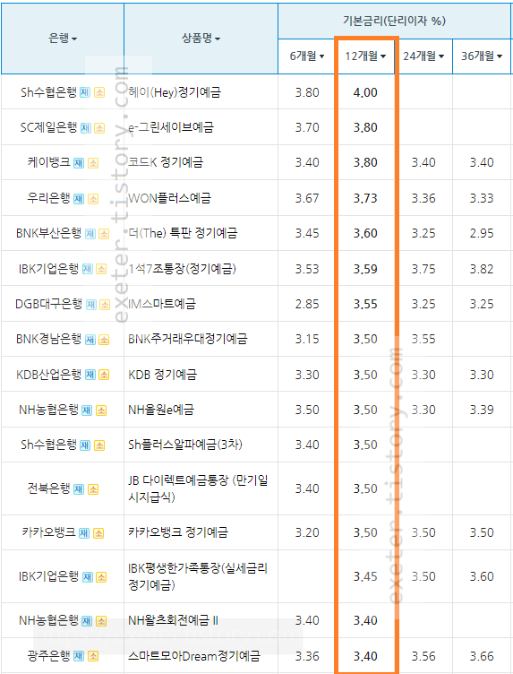 은행 / 상품명 / 기본금리 (단리 이자(%), 12개월 기준)