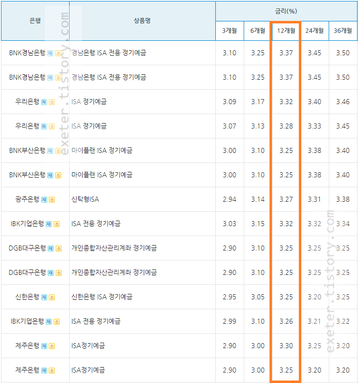 ISA 예금 은행금리 - 1년(12개월) 기준 / 높은 순서 정렬 (중복 은행 제외)