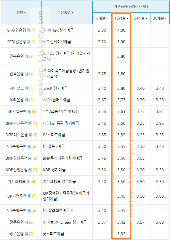 은행 / 상품명 / 기본금리 (단리 이자(%), 12개월 기준)