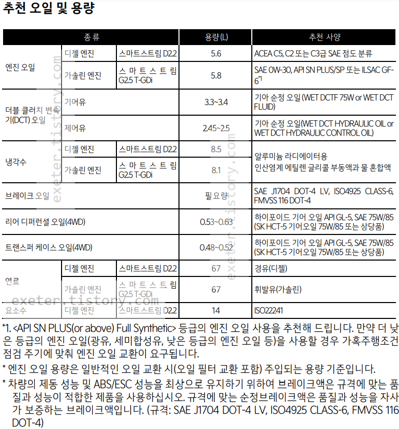 - 엔진 오일 (가솔린 / 스마트스트림 G2.5 T-GDi): 5.8 리터 (SAE 0W-30, API SN PLUS/SP 또는 ILSAC GF-6*1)