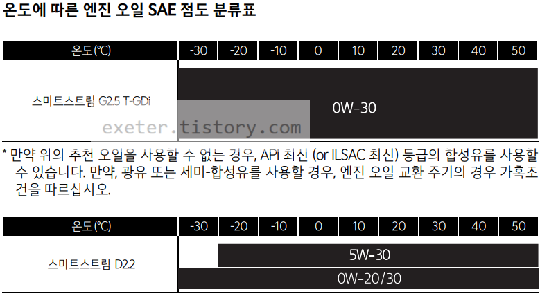 최근 발표되는 현대/기아 신차의 경우 최신 규격인 API SP/GF-6 (가솔린) 엔진오일을 추천하고 있습니다.