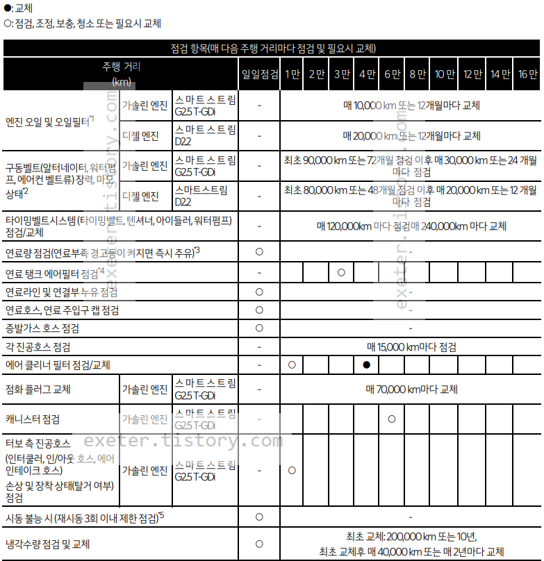 - 연료 필터 카트리 지 점검 및 교체 (디젤 엔진): 3만 km 점검 및 6만 km 교체