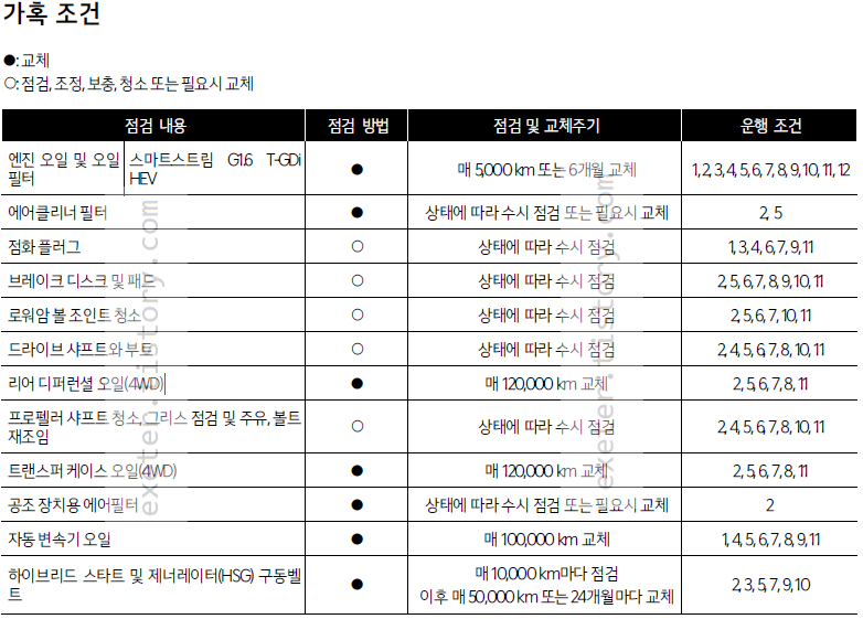 이러한 가혹 조건인 경우에는 가솔린(G1.6 HEV) 엔진오일은 '매 5000 Km 또는 6개월' 마다 교체로 안내하고 있습니다. 가혹 조건인 경우 일반적인 운행조건 대비 점검/교체 주기가 더 짧습니다.