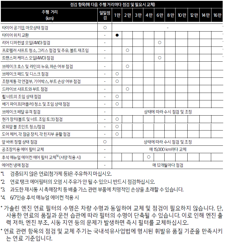 * 연료 관련 항목의 점검 및 교체 주기는 국내석유사업법에 명시된 휘발유 품질 기준을 만족시키는 연료 기준입니다.